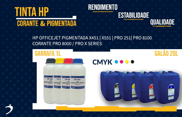 Procurando por uma tinta que não tenha tanto brilho na impressão, mas que garanta ao seu cliente uma maior durabilidade e uma melhor fixação? Consulte nossas tintas pigmentadas HP. Ou então você está procurando uma tinta da qual sua durabilidade na impressão não seja primordial, mas que em quesito acabamento uniforme e alto brilho é nota 10? Veja nossas tintas corantes HP Ambas soluções você encontra aqui com garantia de qualidade assegurada pela nossa linha ink-mate. Possui um ótimo desempenho garantido nos seguintes modelos: